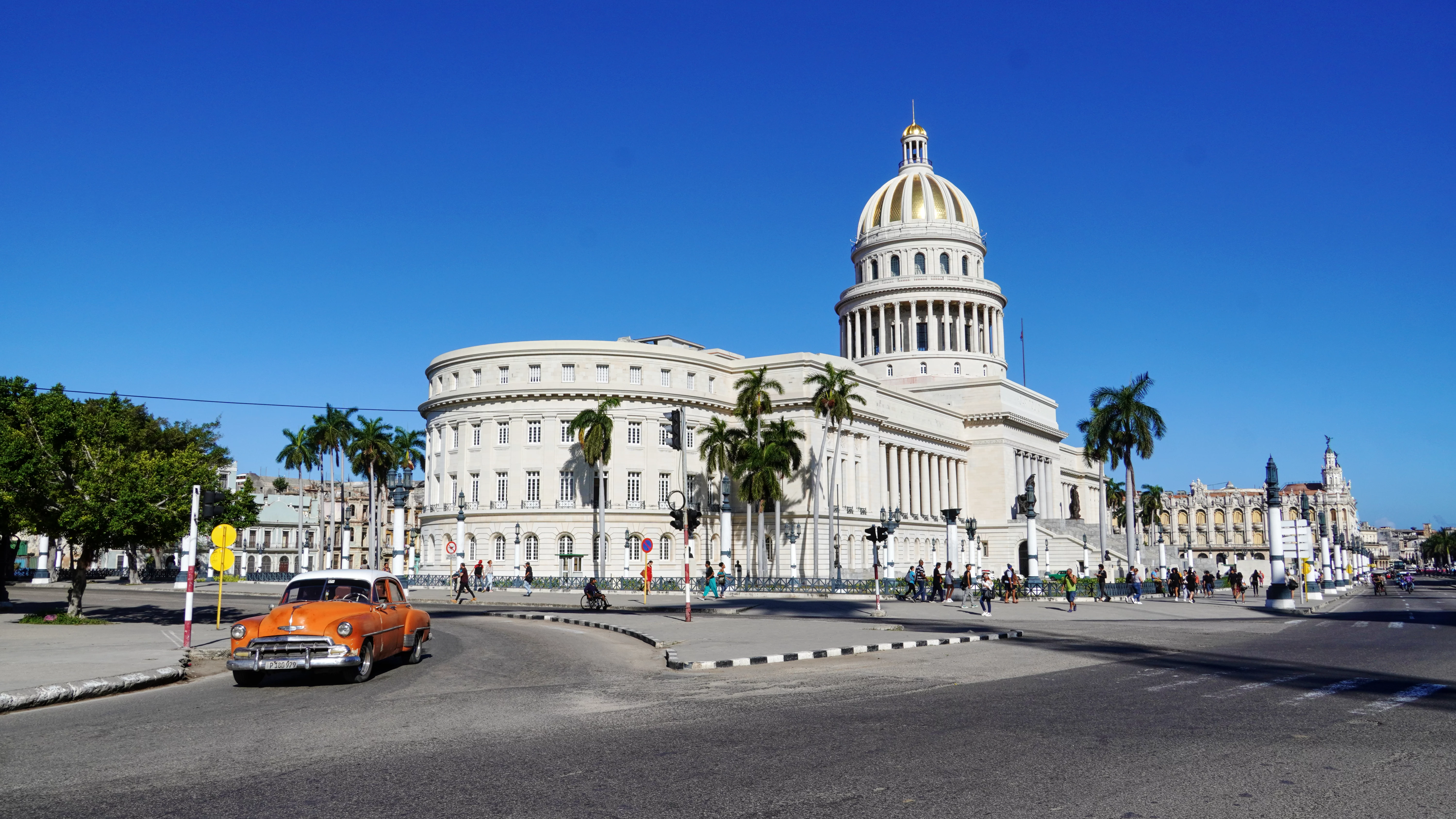 Von der Casa aus schlenderten wir gemütlich durch die Altstadt zum Kapitol. Dort wunderten wir uns zunächst, ob man hineingehen kann. Für 20 USD pro Person gab es eine sehr gute Führung in Englisch oder Spanisch, und das Gebäude ist innen recht beeindruckend. Danach gingen wir am Parque Central vorbei auf der Prado bis zum Ende und machten einen Kaffeestopp im Antojos. Etwas weiter durch die Altstadt – die Shops sind leider nicht gerade ein Highlight, aber am Markt an der Obispo findet man ein paar kreative Artikel. Dann hatten wir ein ausgezeichnetes Mittagessen im Mojito Mojito und kehrten in die Casa zurück. Von dort aus ging es zum gebuchten Abendprogramm, der Rooftop Cocktail Tour, wieder mit Yunior als Guide. Vier Bars, zwei davon in Hotels mit genialer Aussicht und zwei Bars mit genialen Cocktails. Das muss man eigentlich machen – inklusive einer kurzen Fahrt mit einem Chevy Cabrio Baujahr 1948. Danach verabschiedeten wir uns von Guide und Fahrer und gingen am Plaza Vieja Abendessen.